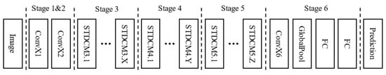 As shown in Figure 6, excluding the input and output layers, the STDC network consists of 6 stages. Stages 1 to 5 downsample the input spatial resolution with a step size of 2, and the final feature map size is 1/32 of the input image. Stage 6 outputs the prediction logic using ConvX, a global average pooling layer, and two fully connected layers. Stages 1 and 2 use only one convolutional block to extract features, thus increasing efficiency.