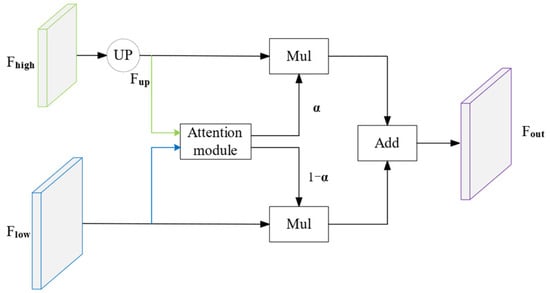 The UAFM uses a bilinear interpolation operation to upsample Fhigh to the same size as Flow, and the upsampled feature is denoted as Fup. Then, the attention module takes Fup and Flow as input and generates the weight α. After obtaining the attention weights, Mul operations are performed on Fup and Flow, respectively. Finally, the UAFM performs the Add operation on the attention-weighted features and outputs the fusion features, calculated as follows:
