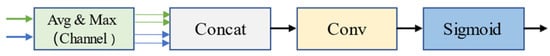 Given input features, Fup ∈ RC×H×W sum, 4 features are first generated by averaging and maximizing operations along the channel axis, where the dimension is R1×H×W. Then, these 4 features are concatenated onto one feature. For the concatenated features, convolution and sigmoid operations are applied to the output α ∈ R1×H×W. The calculation formula of the spatial attention module is as follows: