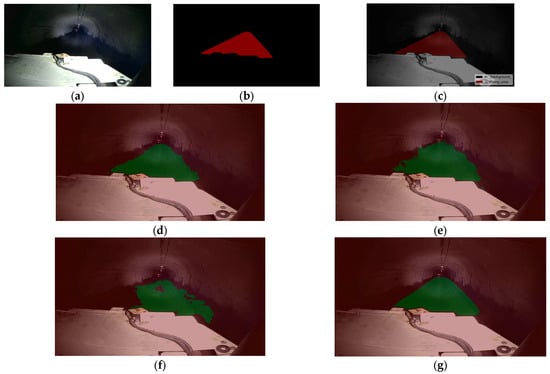 Figure 13 includes the following images: (a) shows the input color image; (b) shows the label; (c) shows the target for road recognition in underground mines; (d)~(g) show the results of different network models.