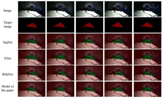 SegNet is a classic semantic segmentation network. In this experiment, mIoU reached 86.55%, and the accuracy rate is the second highest, reaching 97.81%. Its achievement lies in its encoder–decoder structure. The way the decoder performs upsampling directly uses the pooling index when performing the maximum pooling in the corresponding encoder stage to perform non-linear upsampling. However, the frames per second of SegNet is only 2 f/s, which is the slowest among the four networks. The mIoU of ENet reached 85.34%, and the pixel accuracy reached 97.53%, which is similar to that of SegNet. Because the ENet network is relatively light, its operating speed reached 13 f/s, which is much faster than that of SegNet, but it is still not sufficient for real-time purposes. The mIoU of BiSeNet is the lowest, only 74.83%, the Dice is also the lowest, only 83.22%, and the frame rate is only 7 f/s. Compared with SegNet and ENet, BiSeNet has almost no advantages.