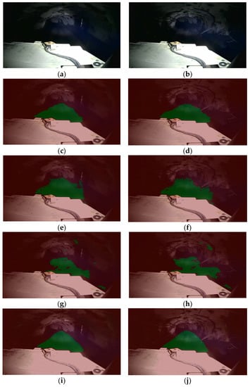 Comparison of the recognition effects of curved roads and sandy roads: (a) bend; (b) wind and sand; (c) SegNet_1; (d) SegNet_2; (e) ENet_1; (f) ENet_2; (g) BiSeNet_1; (h) BiSeNet_2; (i) BiSNet_improved_1; and (j) BiSNet_improved_2.