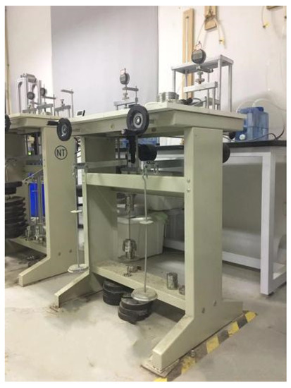 In this study, 48 groups of one-dimensional consolidation/permeability tests were established to clarify the effects of granular gradation and lime dosage on the compressibility and permeability of lime-stabilized slurry with high water content, as shown in Table 2 below. The soil sample had a diameter of 61.8 mm (area of 30 cm2) and a height of 40 mm. Due to the extremely high initial water content of the test soil samples, if a conventional one-dimensional consolidation instrument with an initial loading stress of 12.5 kPa had been used, the loading would easily have led to the destruction of the soil sample and affected the test accuracy. Therefore, an ultra-low stress consolidation/permeability tester with a minimum consolidation pressure of 1 kPa was used for this test, as shown in Figure 1 below [23]. The test loading sequence was as follows: 1 kPa, 2 kPa, 3 kPa, 5 kPa, 7 kPa, 9 kPa, 12.5 kPa, 25 kPa, 50 kPa, 100 kPa, 200 kPa, 400 kPa, 800 kPa, and 1600 kPa. After the completion of each loading level and stabilization for over 24 h, the specimens were considered stable once they were settling by no more than 0.01 mm per hour, and the settlement of the soil sample was measured.