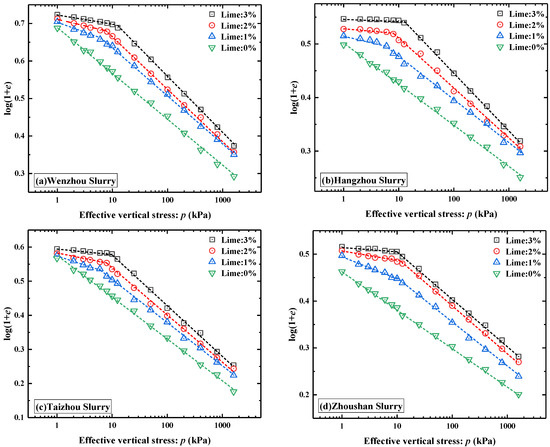 Figure 2. The log(1 + e)–log p curves of slurry for each group with different lime dosages. (a) Wenzhou soil sample, (b) Hangzhou soil sample, (c) Taizhou soil sample, (d) Zhoushan soil sample.