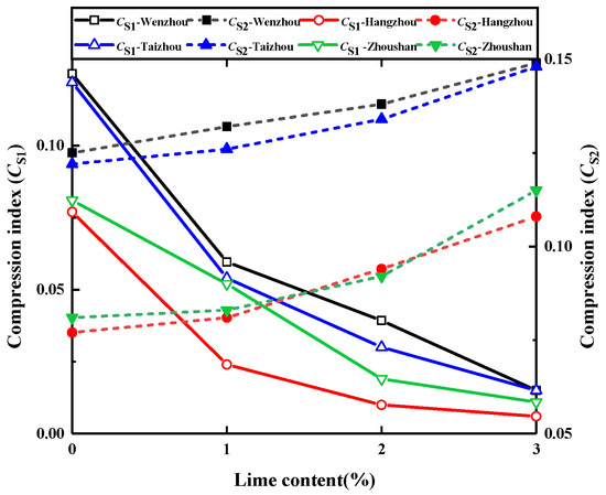 The log(1 + e)–log p curve for the lime-stabilized slurry is shown in Figure 2 below [26]. The p is the applied vertical effective stress and the e is the void ratio. The compression curve of the remolded slurry was a straight line, while the compression curve of the lime-stabilized slurry was represented by two straight lines with different inclines. The horizontal coordinate of the intersection of the two lines marked the remolded yield stress of the soil sample [27]. Figure 3 below shows the compression indices of each group of lime-stabilized slurry at different dosage levels, where CS1 and CS2 are the compression indices of the stabilized slurry before and after yielding, respectively. The test results showed that increasing the lime dosage causes the CS1 of the stabilized slurry to decrease and the CS2 to increase. Taking the Wenzhou slurry as an example, the CS1 of the stabilized slurry at a 1% lime dosage was only 32.3% of that of the remolded slurry, and CS1 was found to decrease gradually with the increase in lime dosage. When the vertical effective stress exceeded its remolded yield stress, the compression index of the stabilized slurry was higher than that of the remolded slurry, and the compression index increased gradually with the increase in lime dosage.