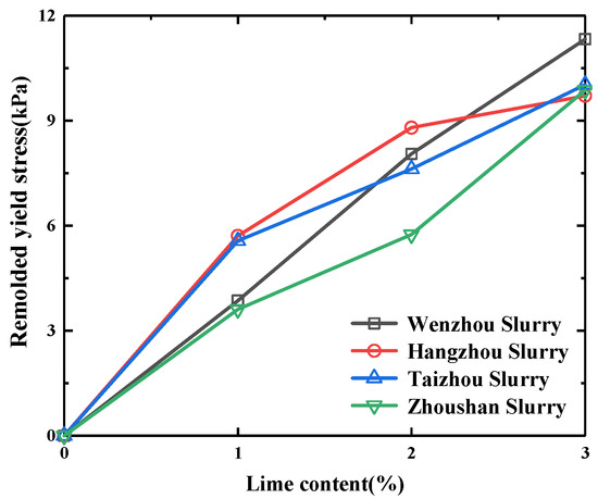 Figure 4. Remolded yield stresses of stabilized slurry for each group with different lime dosages.