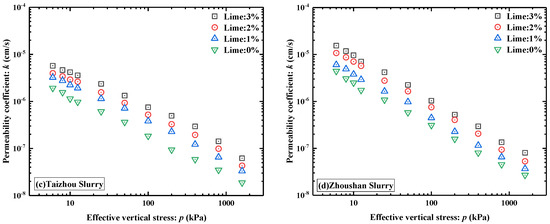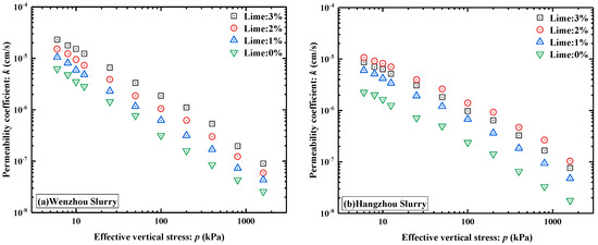 The granular gradation was furthermore observed to affect the permeability coefficient of the lime-stabilized slurry. The permeability coefficient of the stabilized slurry was more substantially enhanced with the increase in clay content. Under a vertical effective stress of 100 kPa, the permeability coefficients of the Hangzhou and Wenzhou slurries rose by 178.0% and 55.1%, respectively, with a 1% lime dosage. It can thus be seen that clay proved more sensitive to lime than silt and that the slurry with high clay content achieved a greater improvement in permeability after lime stabilization than that with silt.