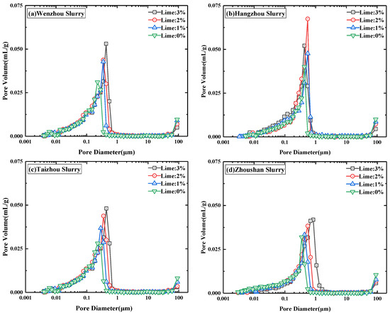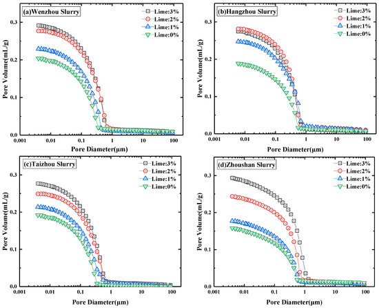 Figure 7. Pore volume distribution curves of stabilized slurry for each group with different lime dosages. (a) Wenzhou soil sample, (b) Hangzhou soil sample, (c) Taizhou soil sample, (d) Zhoushan soil sample.