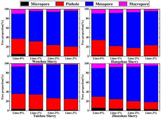 To analyze the variation pattern of pore structures of the lime-stabilized slurry, the pores were classified into four categories: (i) micropores (pore equivalent diameter ≤ 0.01 μm), (ii) pinholes (0.01 μm < pore equivalent diameter ≤ 0.1 μm), (iii) mesopores (0.1 μm < pore equivalent diameter ≤ 1 μm), and (iv) macropores (pore equivalent diameter > 1 μm), as shown in Figure 8 below. The pores in the slurry of each test group mainly consisted of pinholes and mesopores, with a total combined percentage exceeding 80%. After lime stabilization, the percentages of micropores, pinholes, and macropores in the slurry of each test group were found to decrease, while the percentage of mesopores increased and reached its peak with the optimal lime dosage. Taking the Zhoushan slurry and Hangzhou slurry as examples, the percentage of pores in the Zhoushan slurry increased with the increase in lime dosage and reached its peak at a 3% lime dosage, while the percentage of pores in the Hangzhou slurry reached its peak at a 2% lime dosage. Whereas the percentage of micropores and pinholes was observed to increase, that of mesopores decreased when the lime dosage was further increased. The reason was hypothesized to be that the excessive filling of the pores with cementing materials reduced the diameter of the pore throat.