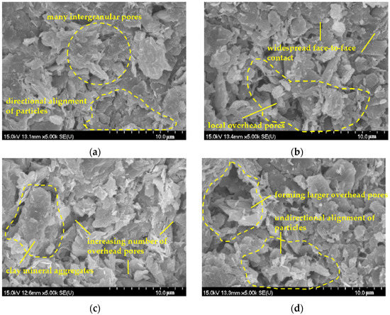 Figure 9. Microstructure of Zhoushan soil samples with different lime dosages. (a) Lime dosage: 0%, (b) lime dosage: 1%, (c) lime dosage: 2%, (d) lime dosage: 3%.