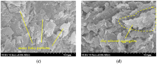 The SEM images of the four types of stabilized slurry with a 1% lime dosage are shown in Figure 10 below. The number of clay mineral aggregates and pore diameters after lime stabilization of the slurry with high clay content was larger than those of the slurry with high silt content. This was hypothesized to indicate, firstly, that the stabilization had a more significant effect on the slurry with high clay content than that with high silt content for the same lime dosage. Secondly, the pore diameters had obviously increased, which manifested macroscopically as noticeably enhanced permeability.