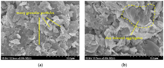Figure 9 below shows the SEM images of the Zhoushan slurry before and after lime stabilization. The remolded slurry soil samples were mainly flaky and granular, and the contact mode between the particles was face-to-face contact, forming a relatively dense soil skeleton. Whereas the pore distribution was dominated by intergranular pores which were mostly round or elliptical in shape and small in diameter, the microstructure of the soil samples had significantly changed after lime stabilization, when the contact mode between particles had become edge-to-face and edge-to-edge contact. The loose soil skeleton was found to have led to an increase in the number of overhead pores which were irregular in shape and relatively large in diameter. With the increase in lime dosage, the particles developed from local edge-to-face contact to overall edge-to-face contact, with a gradual rise in the number of overhead pores.