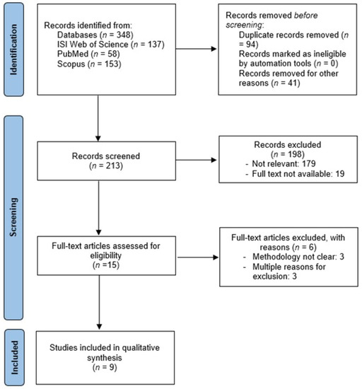The initial search identified 348 potentially relevant articles. After removing duplicates, manual screening was performed according to the title and abstract. Those that were not related to the theme were excluded. Then, the final articles were thoroughly analyzed by two authors (A.C.S. and D.A.M.). The different phases of the systematic review were described using the PRISMA statement [12], which maps the number of records identified, included, and excluded and the reasons for exclusions. Studies were included or excluded using criteria defined using the PICOS (Population, Intervention, Comparison, and Outcome) principles [13]. Literature searches incorporated the following inclusion criteria: (i) male or female volleyball players of any age; (ii) studies that used wearable devices (e.g., accelerometers) to assess and/or monitor physical performance (e.g., jump height, dominant and non-dominant hand actions) in training and/or competition; (iii) experimental and observational studies. Exclusion criteria were: (i) studies with the older population or non-athletes; (ii) samples with a physical, chronic, neurological disability or a clinical diagnosis of attention deficit hyperactivity disorder. Following these criteria, 15 original research articles were evaluated in full text for eligibility. For the qualitative analysis, 9 articles were included. Theses, dissertations, and abstracts or conference proceedings were also excluded. Studies were in English and were published in a peer-reviewed journal. A detailed flowchart, including a systematic literature search, screening, eligibility, and enrollment, is shown in Figure 1.