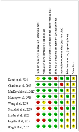 Risk of bias assessment was conducted using the Cochrane Reviews method [14]. Two authors (A.C.S. and D.L.M.) assessed each study’s risk of bias using the following key criteria: random sequence generation, allocation concealment, blinding of outcome assessment, blinding participants and personnel, incomplete outcome data, selective reporting, and other bias; and in the case of inconsistencies between the two authors about which classification to assign to a given criterion, a third author evaluated the study (H.P.N.). The terms used in classifying the studies were low risk, high risk, or unclear risk. The Review Manager software (RevMan, The Nordic Cochrane Centre, Copenhagen, Denmark) version 5.4 was used to build the risk of bias graphs.