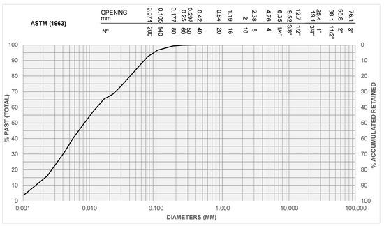 The following tests were conducted to characterize the tailings: (a) the value of the liquidity limit (ωl) through the Casagrande test was obtained equal to 23%; (b) the plasticity limit (ωp) was obtained equal to 12%, and the plasticity index (IP) was equal to 11%; (c) the density of solid particles was obtained using the IGPAI standard (1965) equal to 3.51; (d) the granulometric curve of the tailing under study was determined based on the LNEC (National Laboratory for Civil Engineering) specification (1966a). The grain size curve of the specimen is shown in Figure 2. The results obtained indicated the proportions of sand (12%), silt (74.2%), and clay (13.8%) in the MT, showing that a large part of the tailing particles is the size of silt.