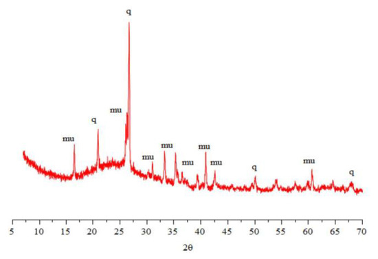 The XRD analysis is shown in Figure 6 allowed to verify that FA comprises mullite minerals (mu = 3Al2O3SiO2) and quartz (q = SiO2). The XRF analysis shown in Table 2 indicated that the predominant oxides in the FA are silica (51.50%), alumina (23.10%) and iron (23%). The high composition of silica and alumina confirms the predisposition of fly ash in the alkaline activation process, representing a source of available aluminosilicates (SiO2 + Al2O3) of approximately 75%. Due to the reduced reactivity of the mine tailings (SiO2 + Al2O3 = 30.71%), implementing fly ash as a precursor material is essential in developing the geopolymeric reactions for the alkaline activation process. Finally, the SEM images showed that the FA was regular, with tendentially spherical particles (Figure 7).