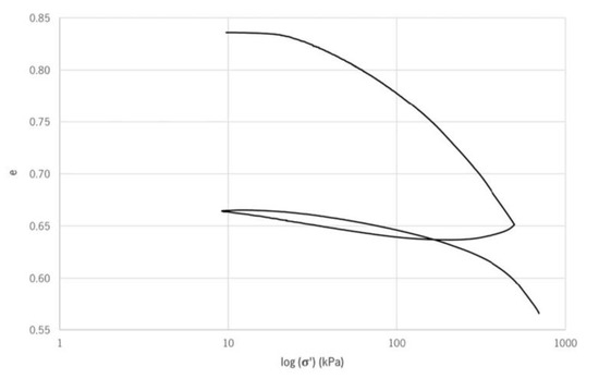 The isotropic consolidation curves (ICC) obtained for the mine tailing in the original and stabilized state are shown in Figure 16, according to the system (log (σ’), e). It is observed that after the stabilization, the mine tailing presents a much lower evolution of the voids index during the loading, unloading and reloading phases. Similarly to what was observed in the ICC of the original tailing specimen, in the ICC of the stabilized tailing specimen, it was also verified that the tailing is less deformable in the trajectory of unloading and reloading than in the first loading cycle.