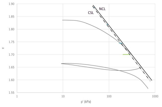 Then, the CSL of the mine tailing after improvement was determined from the stress trajectory of the specimen used to obtain the ICC, in blue, whose initial void ratio was obtained. For the definition of the CSL, it was assumed that this line must be parallel to the NCL. The resulting CSL is represented in Figure 18, with a value of λ = 0.024 and Γ = 1.8705. Once the CSL was determined, the stress trajectory of the remaining specimens was represented, subjected to confining stresses of 50 kPa, 100 kPa and 200 kPa, in green, showing that they do not go beyond the NCL.