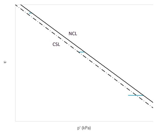 Once the NCL was defined, the critical states line (CSL) was determined. The CSL was defined based on the failure points of the specimens submitted to triaxial compression tests for confining the stresses of 50 kPa, 100 kPa and 200 (NC) kPa. The trajectory of the effective stresses in relation to the trajectory of the total stresses was represented in blue, according to the system (υ, ln (p’)). As the test was carried out in undrained conditions, the variation in the specific volume is null, and therefore, the trajectories result in horizontal straight lines. The resulting CSL is represented in Figure 10. As the specimens presented stress trajectories with different lengths, the CSL was defined based on an average of the trajectories of the three tested specimens (Figure 11). The stress trajectory for the specimen with σ3 = 200 (OC) kPa is also represented in green. The failure trajectory of this specimen ended in the CSL. The CSL was defined based on Equation (4).