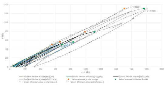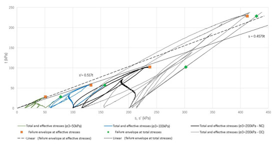 The trajectory in terms of total stresses (s−t) is determined from the stresses imposed during the shear phase using Equations (5) and (6).