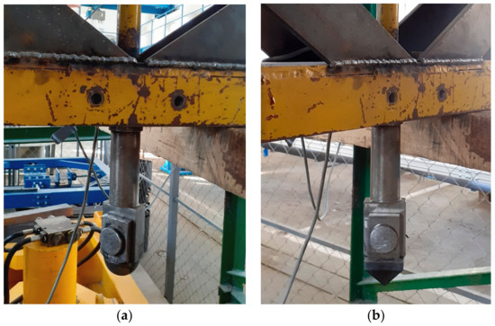 The mass was changed by adding calibrated steel weights (ϕ 200 mm) within the mass range from 50 kg to 110 kg. The head of the hammer may be of various shapes, including spherical, pyramidal, or conical. The testing described in this paper was conducted using the pyramidal and spherical impactors (Figure 3). The tests were limited by a maximum impact height of 2.6 m (limiting height of the testing equipment tower). The impact height, measured using the L-GAGE LT3 Long-Range Time-of-Flight Laser Sensor, may be set to an arbitrary value as required for the performance of particular testing. Various potential impact heights and hammer masses enable a wide range of combinations to be created. This particular stand (Figure 4) facilitates testing of any type of conveyor belts.