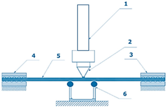 Experiments were conducted on a conveyor belt of the P 2000/4 8 + 4 201A type, i.e., a rubber–textile belt with a polyamide carcass (consisting of 4 fabric plies, Figure 1) with a nominal tensile strength of 2000 N mm−1 and with rubber cover layers—an 8 mm-thick top cover layer and a 4 mm-thick bottom cover layer. This conveyor belt is used for the transport of extremely abrasive, abrasive, granular, and loose materials. Typical applications include thermal power plants, transport of aggregates, mining industry, limestone works, cement works, dumps, docks, recovery and processing of raw materials, processing, and agricultural industry. Belt specimens sized 1200 × 150 mm were fixed into hydraulic jaws and stretched using the force of 30 kN. They were exposed to the impacts of two impactor types, pyramidal and spherical, simulating the shapes of materials falling onto the belt at chutes. The hammer impact height was changed within the range from 0.2 m to 1.4 m, with 0.2 m increments. The hammer mass was changed within the interval of 50–100 kg, with 10 kg increments.