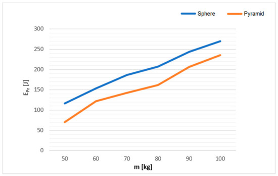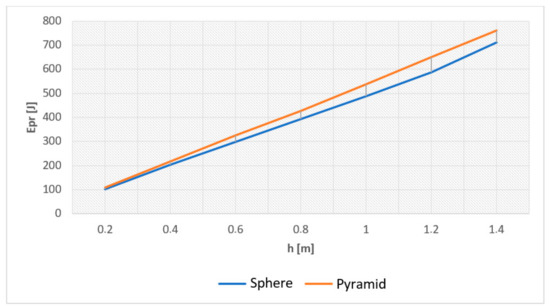 A better comparison is presented in the form of a curve of the correlation between the impact energy and the hammer impact height (Figure 8). It clearly shows that the impact energies of the hammer with the pyramidal impactor were higher than those observed with the spherical impactor while this difference increased with the growing impact height.