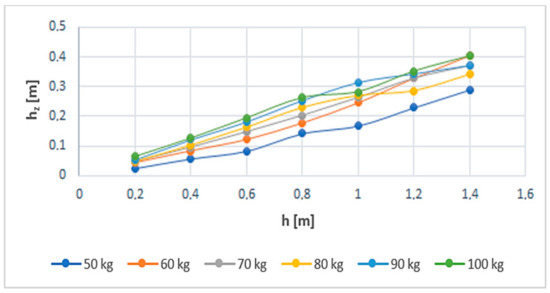 The identified bounce heights enabled the identification of the residual positional energies, calculated using Equation (2), for the individual hammer masses (50–100 kg). The observed results are listed in Table 2.