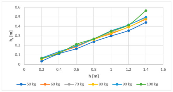 The graph below (Figure 9) represents the curve of a correlation between the bounce height and the impact height for the pyramidal impactor. It is evident that as the impact height increased, the height to which the hammer bounced off the stretched belt increased too. The maximum bounce heights were observed with the hammer mass of 100 kg because, in this case, the unconsumed portion of the total potential energy reached its peak. Figure 10 shows the same comparison, i.e., a correlation between the impact height and the bounce height, but for the spherical impactor. The bounce heights increased more evenly with the increasing impact heights. Again, the maximum values were observed in the experiments with the hammer weighing 100 kg, i.e., the maximum mass value.