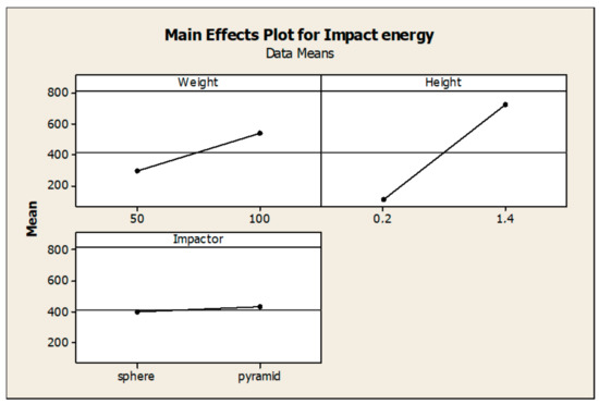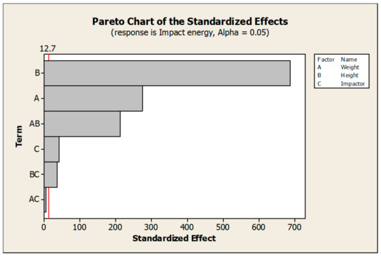 The DOE method [39] was applied to the data obtained in the experiments in order to identify the effects of the factors and interactions that affect the impact energy value. A graphical representation of the main effects of all factors is shown in Figure 15. The significance of these effects may be assessed graphically, typically using a Pareto chart (Figure 16). The charts indicate that the statistically significant effect on the response, i.e., impact energy, was observed for the hammer impact height (Factor B), hammer mass (Factor A), impactor type (Factor C), and interactions between Factors AB and BC.