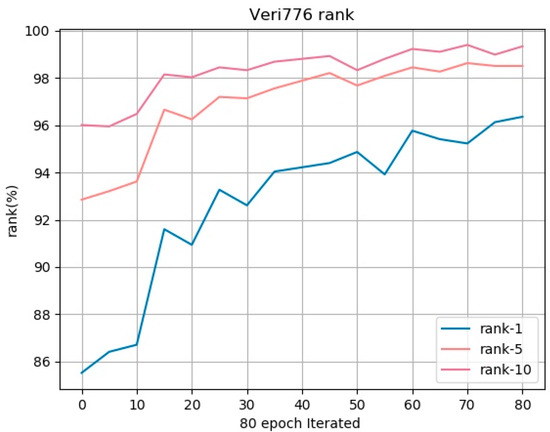By analyzing the experimental results of the cumulative matching curve CMC, the average accurate precision mAP and the loss function loss curve of the training process of the VeRi-776 data set training process and the CMC curves Rank-1, Rank-5, and Rank-10 of the proposed method are shown in Figure 6. It can be observed that with the deepening of network training iterations, the rank indicator has been increasing, which proves the effectiveness of the model.