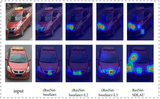 A set of attention visualizations were performed on the final output feature maps of Baseline (ResNet-baseline), Baseline (ResNet-baseline)+L2, Baseline (ResNet-baseline)+L3, and ResNet-SDLAU, as shown in Figure 9. It can be noted that the feature maps of the baseline pay little attention. (ResNet-baseline) just pays less attention to some vehicle regions. As shown in columns 2 and 3, using (ResNet-baseline) +L2 and +L3, different attention mechanisms focus on some salient features instead of some useless areas. The attention of ResNet-SDLAU proposed in this paper can achieve a better balance because it focuses on the salient local parts of the vehicle, such as distinguishable local features such as logos, lights, windows, wheels, etc. This means that the proposed model is better suited to the nuanced features of the vehicle, and the feature embedding becomes more decorrelated and diverse depending on the mode of attention mechanism used.