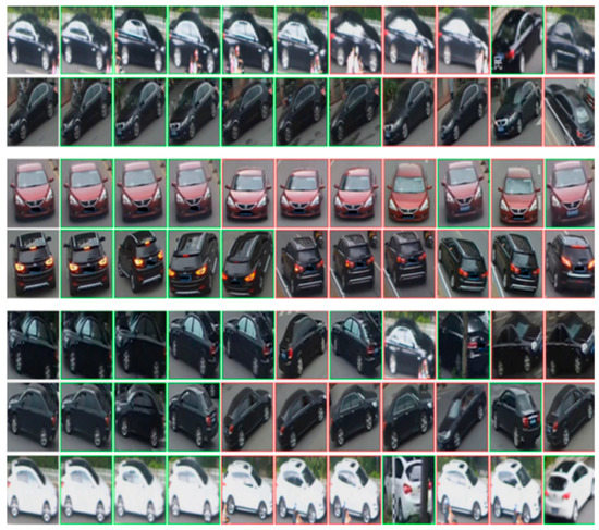 The vehicle data matching analysis is shown in Figure 11, which is an example of ten vehicle re-identification results (Rank-1 to Rank10) on the VehicleID dataset. For each probe, green boxes indicate correct matches, and red boxes indicate false matches.