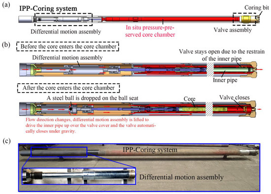 To overcome this issue, in situ pressure-preserved coring (IPP-Coring) technology has been introduced for deep exploration [15,16,17,18,19]. This technology avoids fluid expulsion by maintaining the core pressure at the bottom hole pressure, thereby making it possible to accurately assess the scale of the reservoir contents [20,21,22,23]. At present, scholars around the world have performed much research on in situ pressure-preserved coring technology and developed many types of IPP-Coring equipment. For example, to obtain cores from offshore gas hydrates for research, the pressure core barrel (PCB), advanced piston corer (APC), pressure core sampler (PCS), hydrate autoclave coring equipment system (HY-ACE), and pressure temperature core sampler (PTCS) have been developed by different countries and institutions in the past few years [24,25,26,27,28,29,30]. For onshore coring for deep oil and gas exploration, the GWY194-70BB and GW-CP194-80A pressure coring systems are two typical types of IPP-Coring equipment; their pressure preservation capacities can reach 20 and 60 MPa, respectively [31,32]. In current IPP-Coring devices, their pressure preservation principle is mainly the closure of a ball valve or flap valve to form a sealed chamber to maintain the in situ pressure of the core sample. The closure of the valves depends on the relative movement between the core (inner) pipe and the outer pipe through a mechanical device such as an overshot assembly or a hydrodynamic-pressure lifting device such as a differential motion assembly. In onshore deep oil and gas exploration, due to the small inner diameters of common oil drill pipes, tripping the mechanical device in the hole has been a problem; usually, it is necessary to use specialized drill pipes, which wastes considerable effort and cost. Therefore, relative movement between the core tube and outer tube often depends on the hydrodynamic-pressure lifting device in onshore deep oil and gas explorations, namely, the differential motion assembly in this study [32].