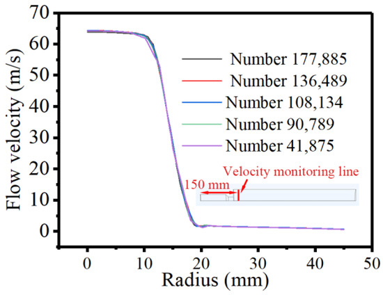 The velocity distributions along the radial direction at a line 150 mm away from the inlet under a flow rate of 0.04 m3/s and fluid viscosity of 100 mPa·s were used to analyze the grid independency. The results of the grid independence study are shown in Figure 3; it shows that when the number of grids is more than 108,134, the solution is grid independent.