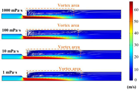 Velocity streamlines in the differential motion assembly with different fluid viscosities; the flow rate was 0.04 m3/s.