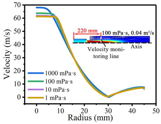 Velocity distributions at the monitoring line with different fluid viscosities; the flow rate was 0.04 m3/s.