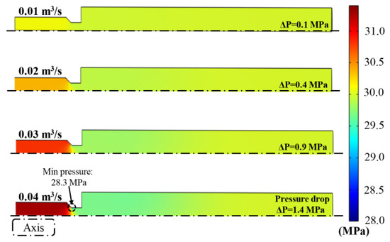 Pressure contours in the differential motion assembly with different inlet flow rates (0.01~0.04 m3/s); the fluid viscosity was set as 100 mPa·s.