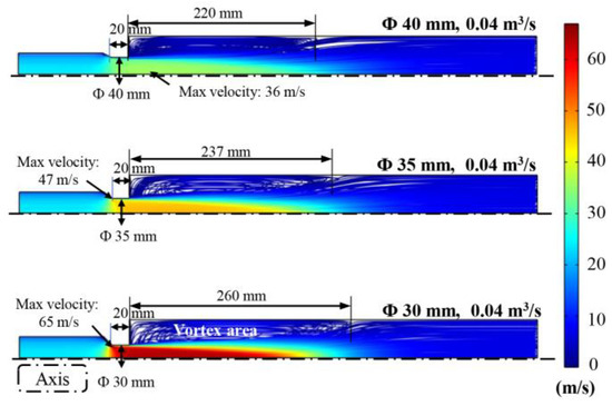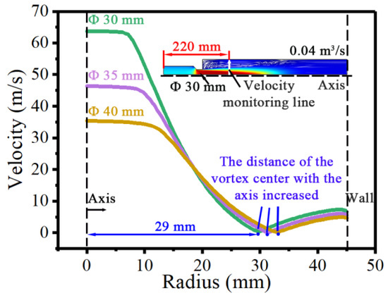 Section 3.1 shows that the change in the flow status was largest at the ball seat. Therefore, we studied the effect of the diameter of the ball seat on the flow characteristics for ball seat diameters of 30, 35, and 40 mm. Figure 9 shows the effect of the diameter of the ball seat on the flow velocity. With the increase in the ball seat diameter, the velocity of the drilling fluid in the differential motion assembly decreased remarkably. The maximum velocity in the differential motion assembly with a 40 mm ball seat diameter decreased to 36 m/s, which was only 0.55 times that of the original assembly with a 30 mm ball seat diameter. In addition, the position of the maximum velocity changed; it was no longer at the inlet of the ball seat. This meant that the erosion at the inlet of the ball seat could be improved more after the diameter of the ball seat was increased to 40 mm. In addition, in Figure 9, the axial length of the vortex area decreased to 0.85 times that of the original differential motion assembly with a 30 mm ball seat diameter when the ball seat diameter increased to 40 mm. To further study the velocity distributions in the vortex area, we extracted the velocity at the monitoring line for ball seats with different diameters, as shown in Figure 10. As the ball seat diameter increased from 30 to 40 mm, the velocity at the axis decreased from 64 to 35 m/s, and the velocity in the central jet area markedly decreased. Moreover, the distance of the vortex center (the place the velocity was near 0 m/s) with the axis increased from 29 to 33 mm. This meant that the radial length of the vortex area also decreased. Therefore, it can be concluded that the increase in the diameter of the ball seat decreased the size of the vortex area. Figure 10 also shows that when the diameter of the ball seat increased from 30 to 40 mm, the velocity near the wall in the vortex area decreased to 0.67 times that of the model with the original ball seat diameter. The decreases in the size of the vortex area and the vortex velocity near the wall would reduce erosion by drilling fluid and the risk of sticking when the differential motion assembly was triggered.