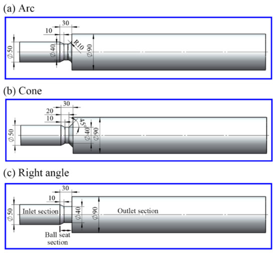 Differential motion assembly with different ball seat outlet structures: (a) arc, (b) cone, and (c) right angle.