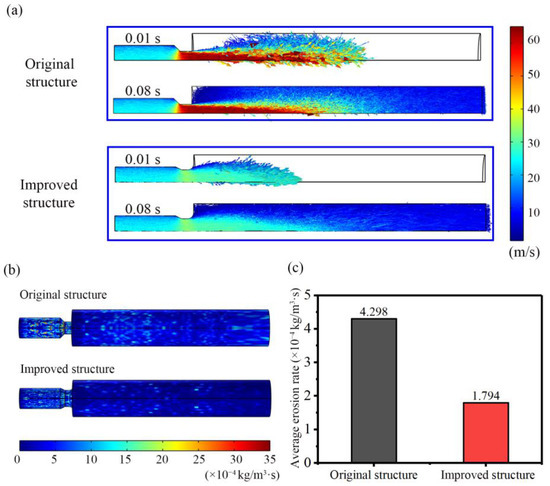 (a) Particle trajectories of the original and improved differential motion assembly; (b) the erosion contours of the original and improved differential motion assembly; (c) the average erosion rate of the original and improved differential motion assembly; the fluid viscosity was set as 100 mPa·s and the inlet flow rate was 0.04 m3/s.