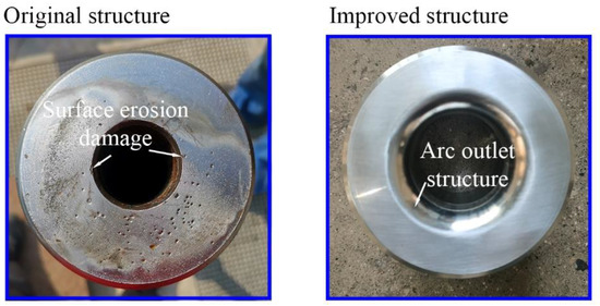 The photographs of the outlet of the ball seat of the original and improved differential motion assemblies after the experiments are shown in Figure 17. It can be seen that there was obvious erosion damage at the outlet of the ball seat of the original differential motion assembly, while the outlet of the ball seat of the improved differential motion assembly was relatively smooth and no obvious surface damage can be observed. In addition, the circulation pump pressure of the system with the improved differential motion assembly decreased from 0.2 MPa to nearly 0 MPa compared with that of the system with the original differential motion assembly. Therefore, it can be validated that the improved differential motion assembly shows the best erosion resistance and the lower pressure drop; thus, it has better promise for field performance.