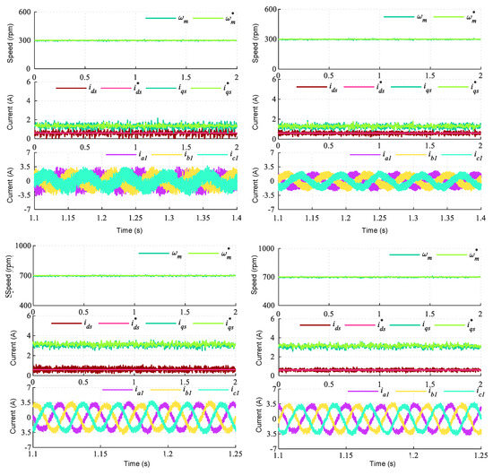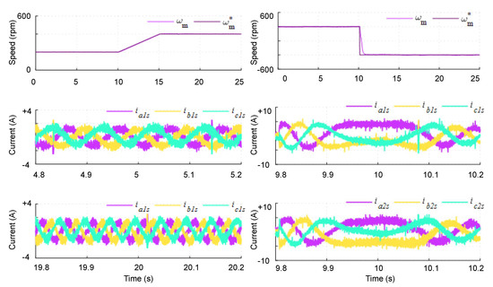 Figure 11 shows the experimental results for a speed ramp test. It can be seen that the proposed scheme is able to deal with transient states. During the test, the reference speed is changed from 200 (rpm) to 400 (rpm). The tracking of the reference speed is satisfactory (see the upper plot in