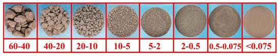 The original tested material of the specimens was crushed coal gangue, which was collected from a coal mine in Xiangtan city. The waste coal gangue in this mine is shown in Figure 1. Nearly 15 tons of coal gangue were transported to the laboratory for indoor tests and research. The original particle size of coal gangue not only contains fine particles less than 0.075 mm, but also includes stones of tens of centimeters. It should be noted that the maximum particle size allowed by the test equipment in this test does not exceed 60 mm. Considering that the specimens in this test were prepared manually, CGSF with particle sizes greater than 60 mm were removed. The color of coal gangue particles is black and black-gray, and the coal gangue has not experienced spontaneous combustion. Coal gangue particles are angular, sharp, and hard with a rough surface and an irregular shape. The CGSF was dried to constant weight in an oven at 105–110 °C (more than 24 h), and then the standard sieve tests with aperture sizes of 60, 40, 20, 10, 5, 2, 0.5, and 0.075 mm were carried out. Coal gangue particles of each group after sieving tests were displayed in Figure 2. According to the JTG 3430-2020 Chinese standard for soil test method [18], the natural moisture content of CGSF is 2.20–2.98%, the liquid limit, the plastic limit, and the plasticity index of fine particles are 31.46%, 20.57%, and 10.89%, respectively. The coal gangue of this coal mine mainly includes sandstone, limestone, shale, and mudstone.