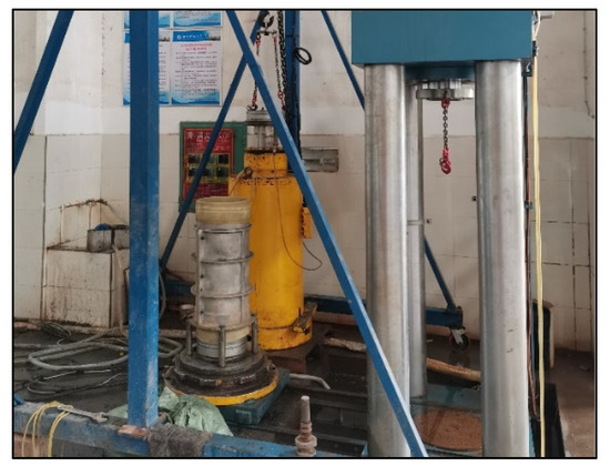 An LSDSTA manufactured by Chengdu Donghua Zhuoyue Technology Co., Ltd. (Chengdu, China), was used in this test, which is shown in Figure 3. The specimen sizes allowed by the LSDSTA are = 300 mm and = 600 mm. The ratio between the triaxial specimen diameter and the maximum particle size should not be smaller than 5 [19,20,21]; therefore, the maximum particle size allowed by LSDSTA in this test is no greater than 60 mm, and then the effect of specimen size can be neglected. The LSDSTA mainly includes the following parts: (1) a data acquisition system through a computer, (2) a testing machine control system, (3) a triaxial pressure cover, (4) an axial loading system, (5) a volumetric strain measurement system, and (6) a sample preparation mold, which are shown in Figure 3. The LSDSTA can automatically collect test parameters, such as axial load and displacement, confining pressure, pore pressure, and volumetric strain, as well as realize the static shear test and cyclic dynamic loading test. In addition, the large-scale triaxial tests and the same specimen size were widely used in the previous studies, e.g., Cai et al. [20] and Leng et al. [21], which guarantees the reliability of this apparatus.