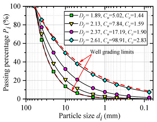 The only way to characterize the grading of granular materials is to use the grading curve. The grading curve contains a large amount of data; however, it lacks quantitative indicators. Hence, it is difficult to make the comparison of the particle size distribution with different gradings of granular materials. In order to completely express the grading of particles and quantitatively analyze the relationship between grading and relevant mechanical indexes, the grading of granular materials is quantified by establishing the grading equations with mathematical formulas, which has great significance for engineering practice and academic research. In this test, the method of artificial sample preparation according to FMGE was used, and the FMGE is defined as [22,23,24]