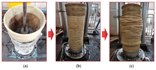 Figure 5 shows the process of the large triaxial tests. First, the above drying CGSF (as displayed in Figure 2) should be well mixed according to the designed grading curve (as shown in Figure 4). The specimen prepared in this test was too large and heavy at the laboratory. Therefore, the specimen was compacted with a compaction hammer in a mold in five layers (as shown in Figure 5a). Before placing CGSF on the next layer, the surface of the previously compacted layer was scraped to a depth of about 20 mm to guarantee well-interlocking vertically adjacent layers, just as in other studies [20,29,30]. The target compaction degree of the CGSF specimen was reached by controlling the thickness of each individual layer and the mass of added CGSF. After compaction, a rubber membrane was used to enclose the specimen, and the top and bottom of the specimen were tied with rubber ropes. Figure 5b displays the prepared sample.