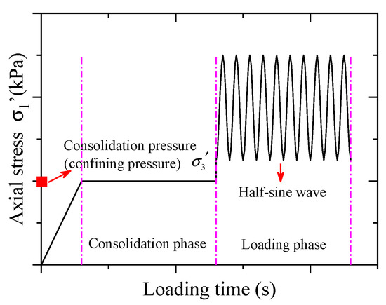 The research shows that traffic loading is different from the sine wave, but very similar to the half-sine wave [34]. Therefore, the half-sine wave was used to simulate the traffic cyclic dynamic loading. The dynamic loading frequency was chosen as 1 Hz in these tests, which was also used in [21,34]. This paper mainly focuses on the permanent deformation of CGSF, and the confining pressures (i.e., effective consolidation stress), , of 50, 100, and 150 were selected in this test. The cyclic dynamic loading in railway subgrade is generally distributed between 35 kPa and 185 kPa [35,36]. Therefore, the axial dynamic stress amplitude was taken as 180 kPa in the separate loading test of each sample, and each specimen was loaded with 30,000 numbers of half-sine wave separately in this test. In addition, Wang et al. [37] studied the permanent deformation of reinforced gravelly soil filler under cyclic loading with dynamic stress amplitudes of 90 kPa and 135 kPa.