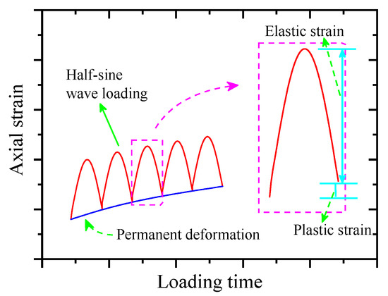 The elastic strain will recover during the loading and unloading process, while the plastic strain cannot recover and will gradually accumulate, resulting in the failure of the sample. Therefore, the cumulative plastic strain causes permanent deformation, and the permanent deformation () studied in this paper is the cumulative plastic strain under cyclic loading. The calculation diagram is shown in Figure 7.