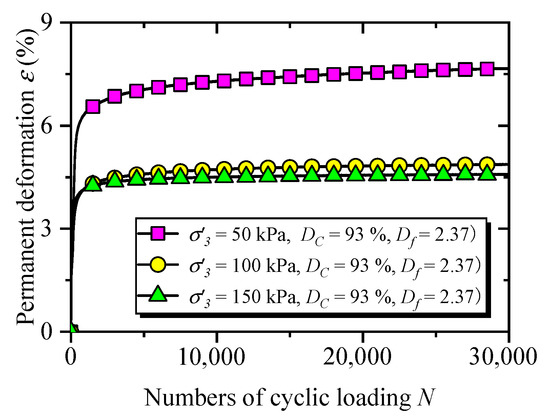 According to the above test scheme, the relationship between the permanent deformation () and the numbers of cyclic loading (N) with different confining pressures is shown in Figure 8. The following can be seen from Figure 8: (1) The relationship curve between and N can be divided into three stages. The first stage is the rapid growth phase, and the curve has approximately linear growth. The second stage is the deceleration growth phase; the curve growth rate slows down obviously, and the curve gradient decreases gradually. The third stage is the approaching stability phase, and the permanent deformation closes to stable. (2) As observed in Figure 8, decreases by 2.79% when the confining pressure increases from 50 kPa to 100 kPa, whereas decreases by only 0.30% when the confining pressure increases from 100 kPa to 200 kPa. Hence, the effect of confining pressure on is related to the level of confining pressure. When the confining pressure is smaller, its effect on is significant, whereas when the confining pressure is larger, its influence on is smaller. This also reflects that the effect of traffic cyclic loading on subgrade decreases with the increase of subgrade depth.